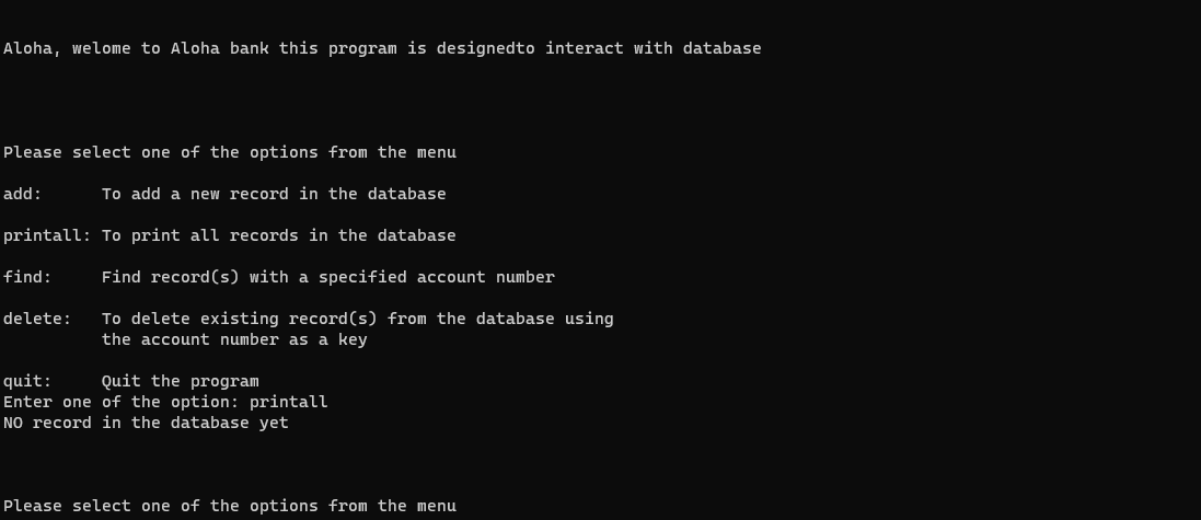 The interface is where data is received from the user and interacts with the bank system. For security concerns, this is the only way for users to interact with the database. Users can choose to add, find, delete, quit, or print data that is in the database.